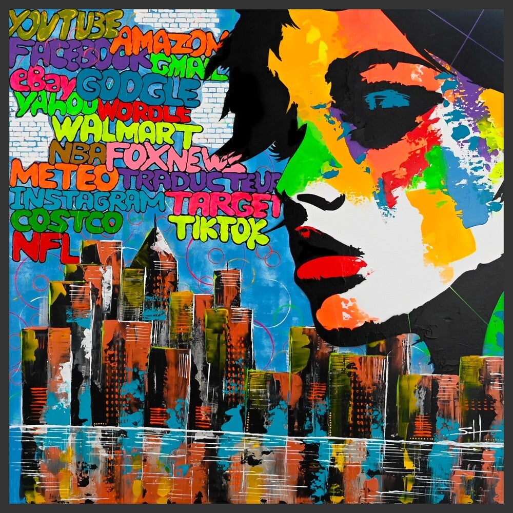 Le livre de DESMURGET est ici peint à ma façon, avec des nuages de mots, que vous connaissez, que vos enfants connaissent, et qui effacent le bleu du ciel, obscurcissent les couleurs de nos reliefs, et assombrissent les lumières de nos villes. Ces mots, ces marques, n’ont pas été choisis au hasard. Ils ont un sens, puisqu’il s’agît des 18 mots les plus recherchés sur Google, à l’échelle mondiale et sur les années 2023 et 2024. S’il y a quelques années, les recherches se focalisaient grandement sur le sport, la musique, le cinéma, l’histoire et la politique, aujourd’hui, force est de constaté que nos besoins s’orientent vers les réseaux sociaux, le virtuel, ainsi que sur les plateformes d’aide à la consommation rapide.