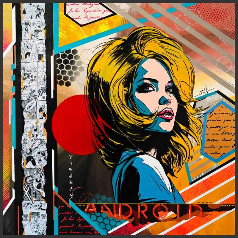 Cette toile mélange l'abstrait, le Street Art et la pop culture, avec du collage, du graff. et l'utilisation d'un panel large d'outils à peindre. J'ai souhaité réinterpréter l'androïde 18 dans un style plutôt Européen. Les cyborgs sont faits de métal et pour cette raison une très grosse partie de ma toile est couverte de peintures métalliques, comme l'or, l'argent, l'étain et grandement le cuivre. Ces choix de coloris qui procurent une luminosité assez incroyable à ma création.